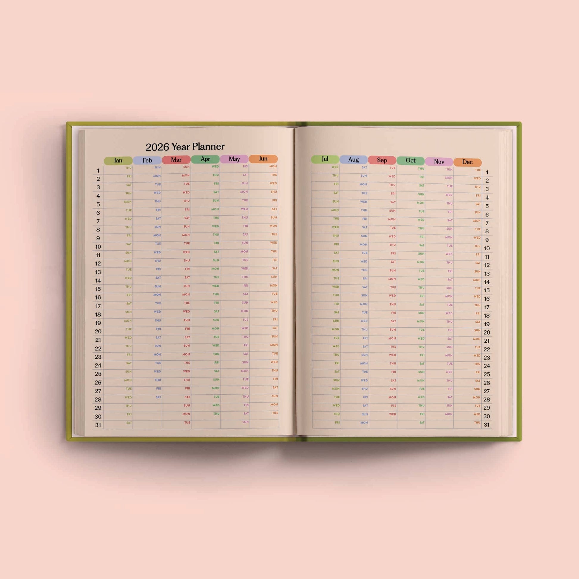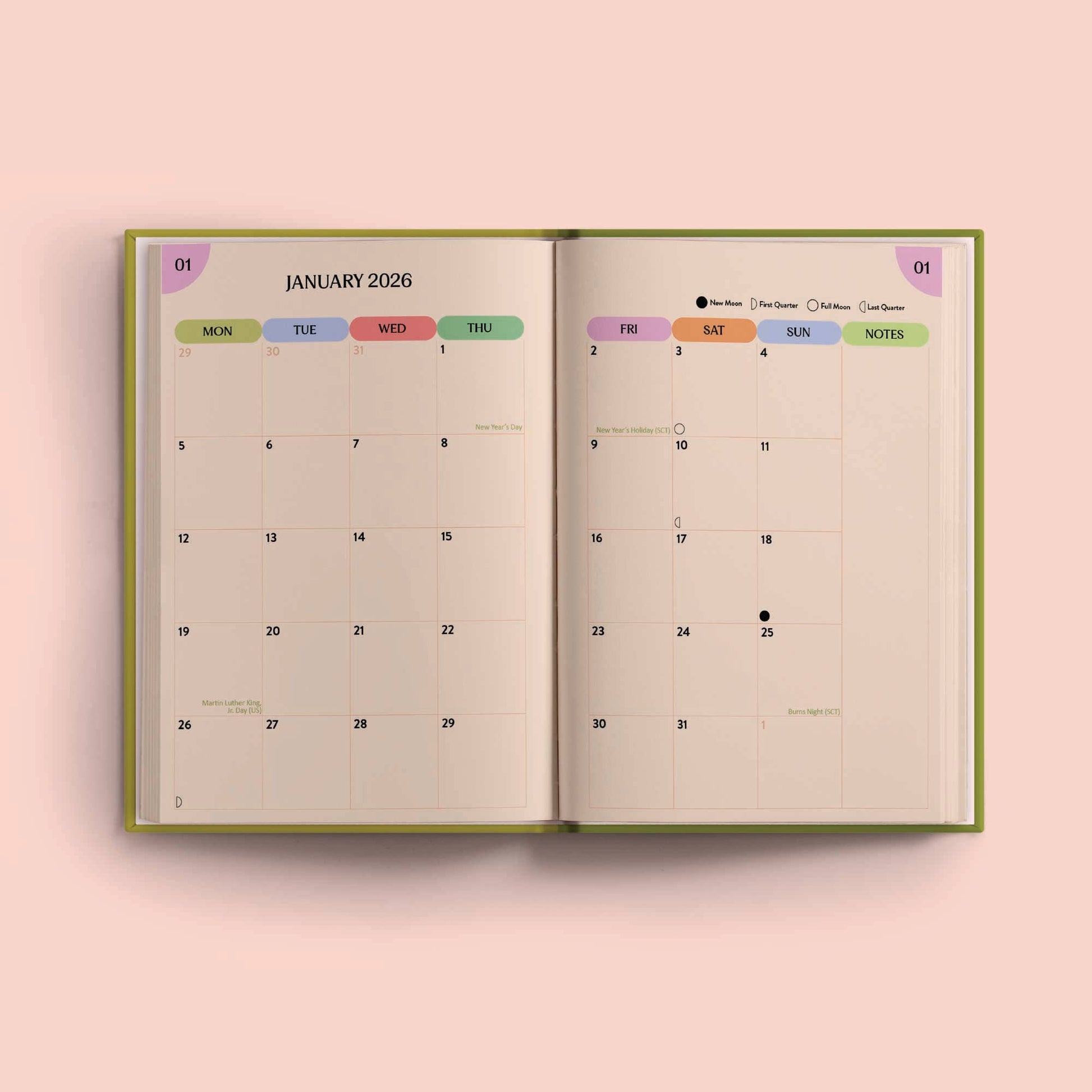 A5 hardback diary for 2026 – week-to-view layout on the left, full lined notes page on the right. Includes month-to-view pages, yearly overviews (2026 & 2027), moon phases, UK & US holidays, and goal space.