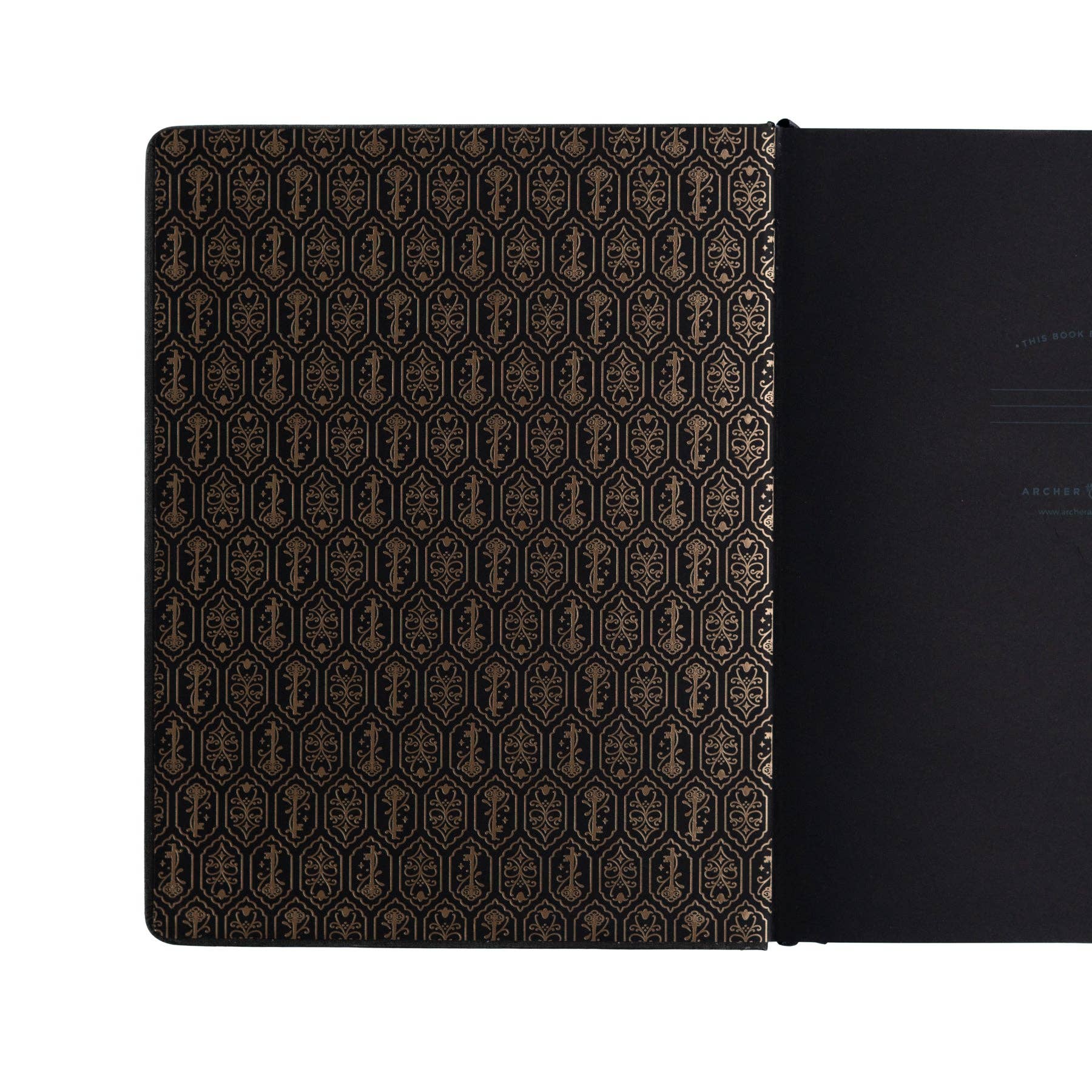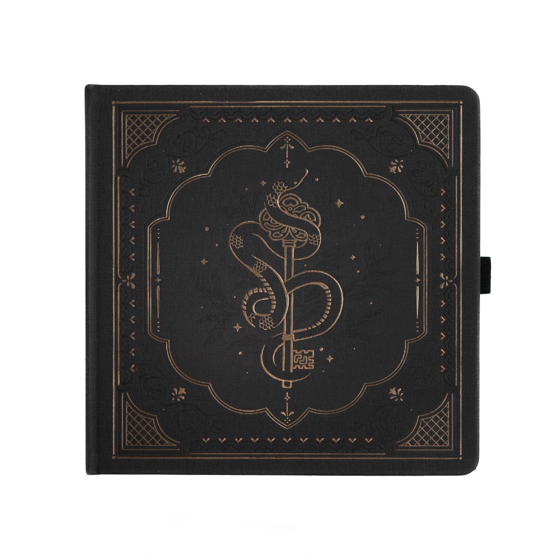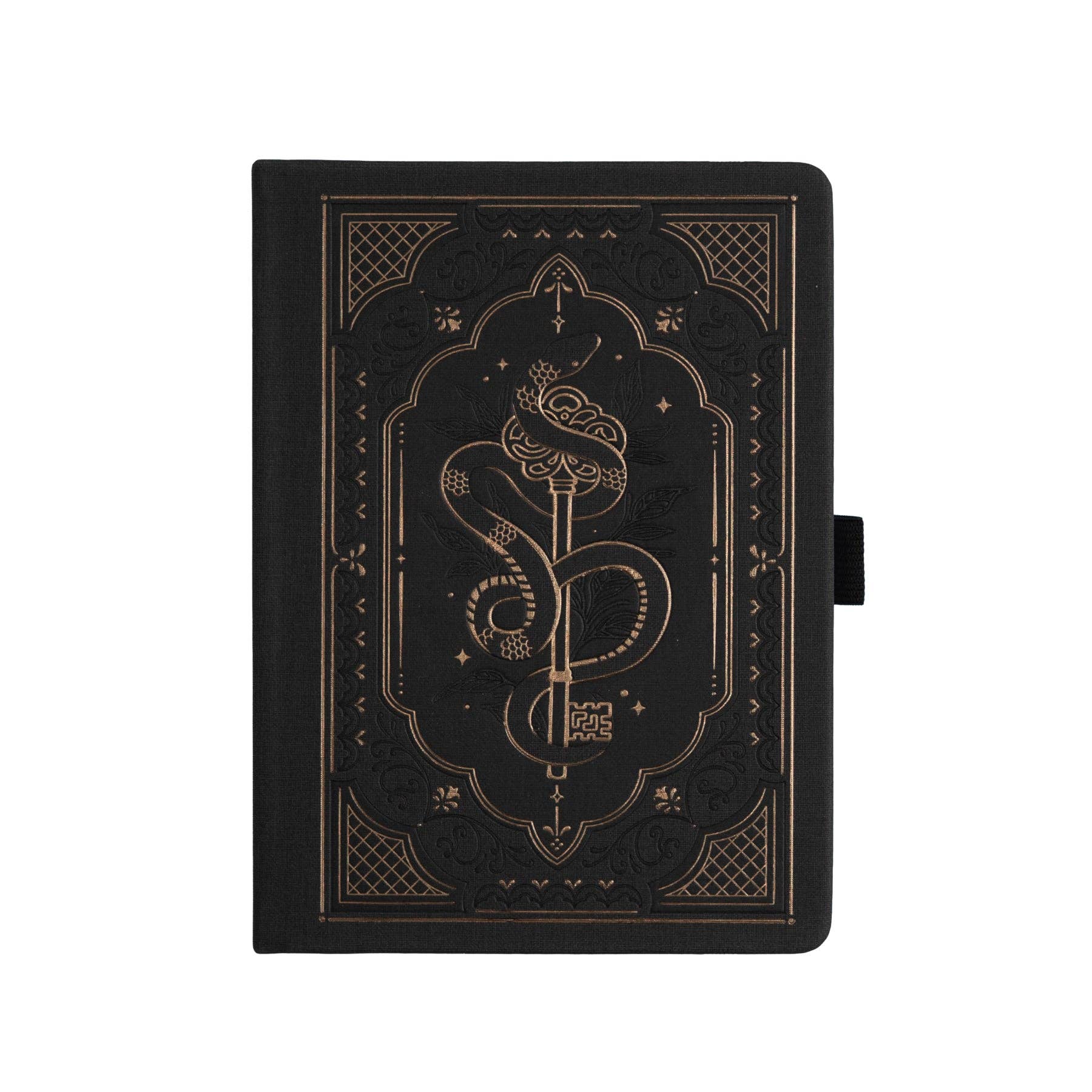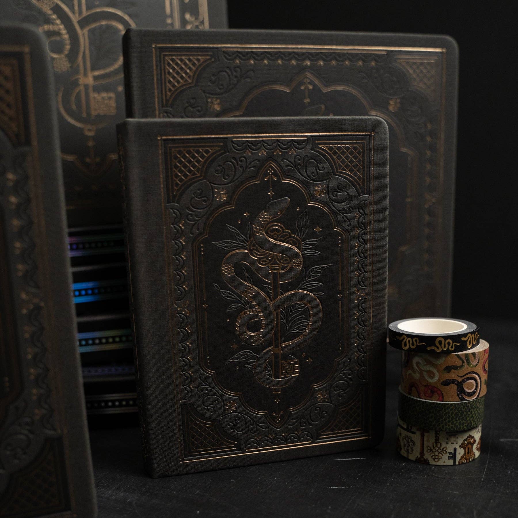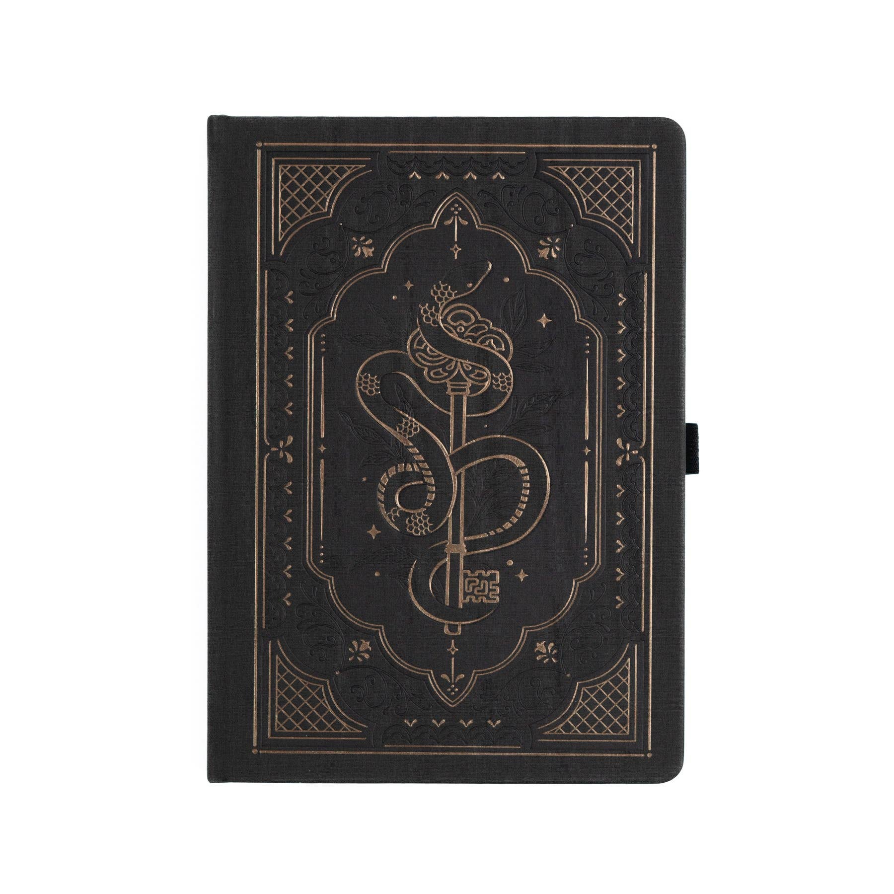 Add mystery and elegance to your seasonal lineup with the Coiled Key Dot Grid Notebook, featuring a gold-foil snake entwined around a vintage key on a smooth black vegan leather cover. This striking design pairs perfectly with Halloween displays yet holds timeless appeal for year-round sales.