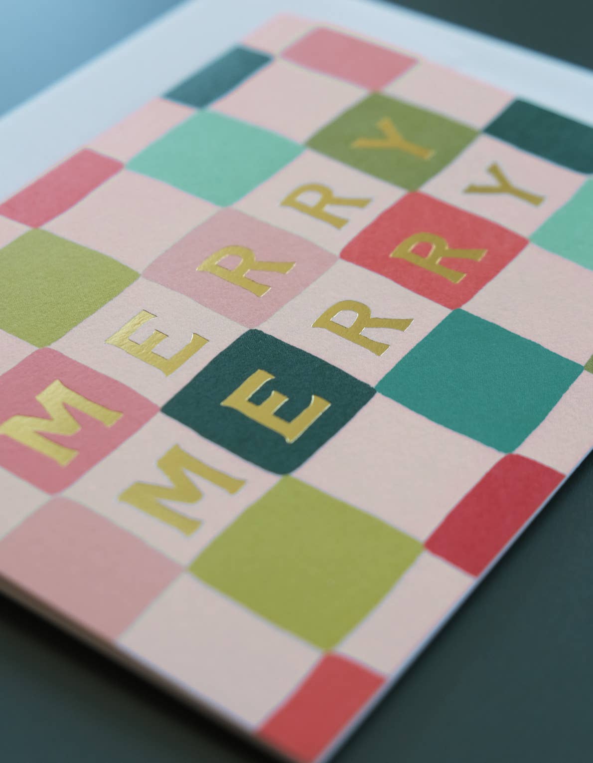 Hand-painted checks in shades of pinks, corals, reds, and greens are brightened with a message in gold foil detail.