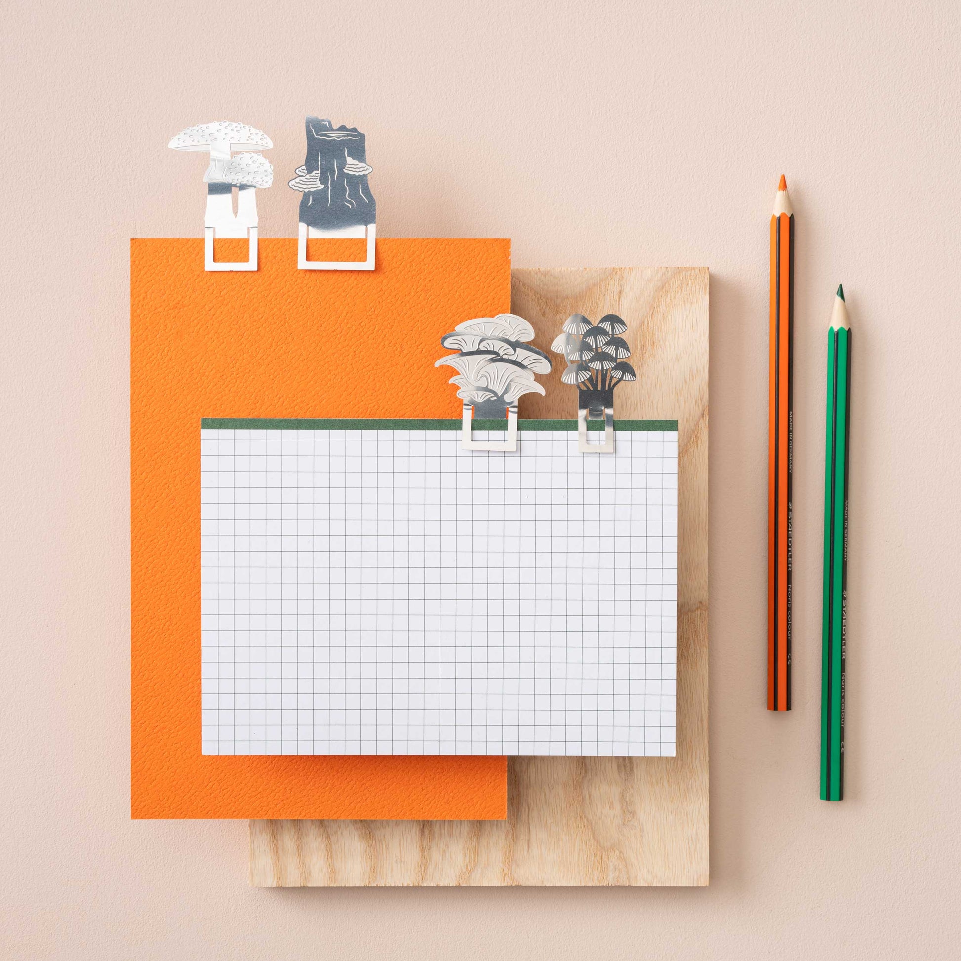 This set of fungi bookmarks features some of our favourite mushrooms we've found when foraging through forests: Clustered bonnet (Mycena inclinata), Fly agaric (Amanita muscaria), Hoof fungus (Fomes fomentarius) and Oyster mushrooms (Pleurotus osteatus).