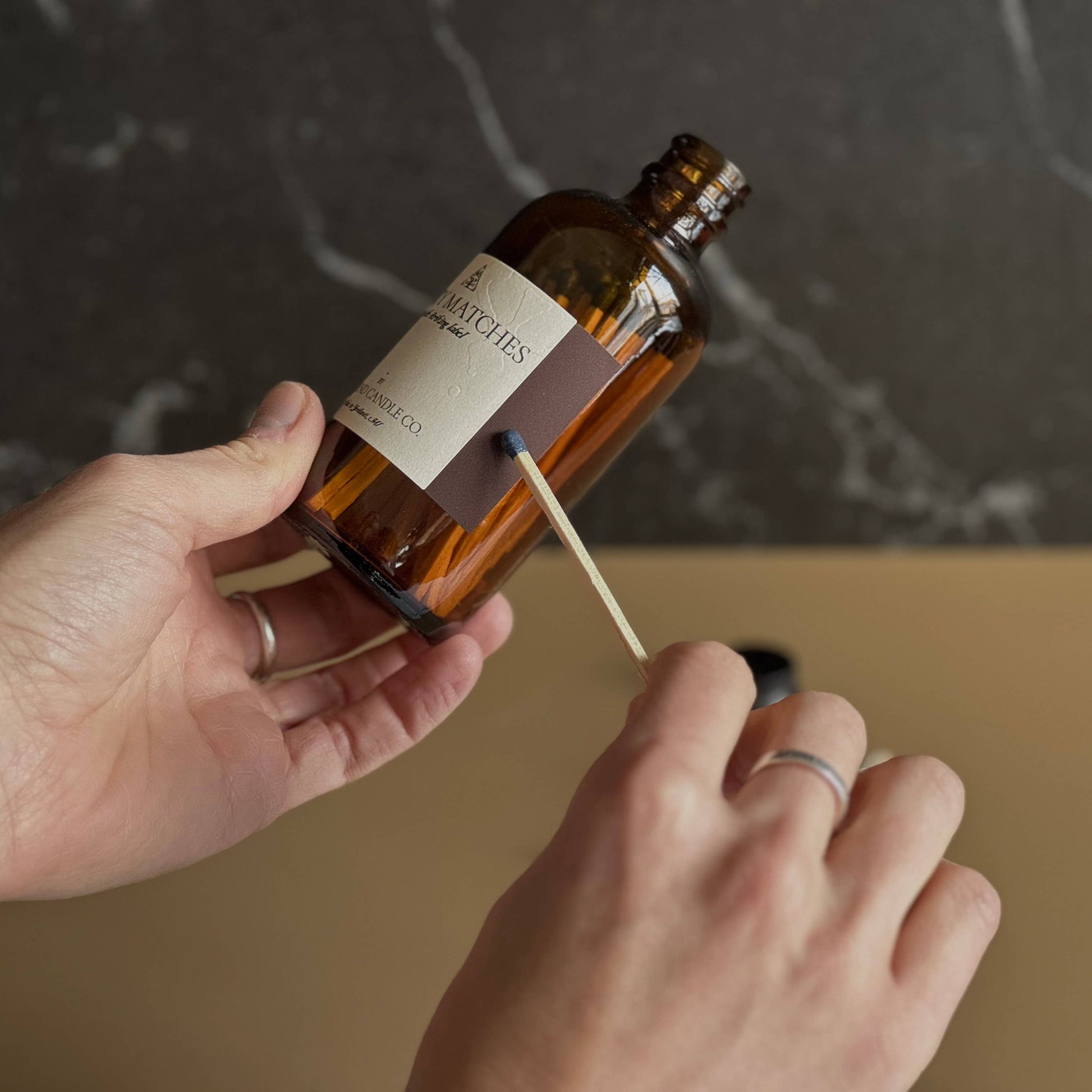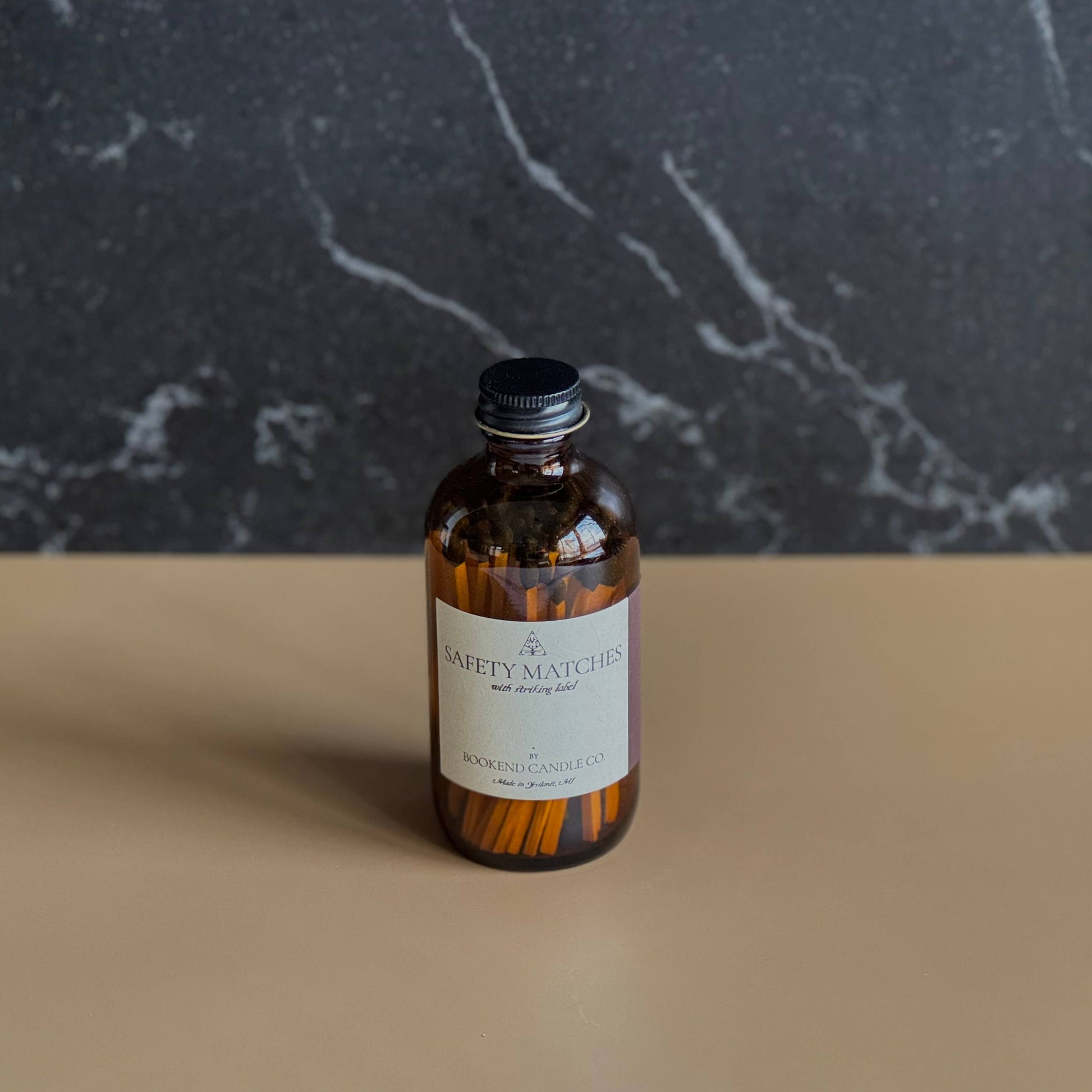 The perfect accessory to pair with candles! This classic amber jar and label with navy tipped safety matches and a striking label. Glass jar dimensions: 4.5" x 2" Matchstick size: 3" Matchstick count: 45 apothecary gifting striker matchsticks accessories